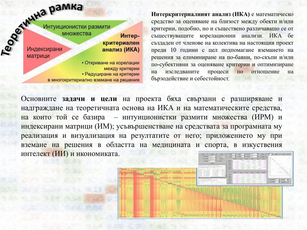 Интеркритериалният анализ (ИКА) е математическо средство за оценяване на близост между обекти и/или критерии, подобно, но и съществено различаващо се от съществуващите корелационни анализи. ИКА бе създаден от членове на колектива на настоящия проект преди 10 години с цел подпомагане вземането на решения за елиминиране на по-бавни, по-скъпи и/или по-субективни за оценяване критерии и оптимизиране на изследваните процеси по отношение на бързодействие и себестойност.